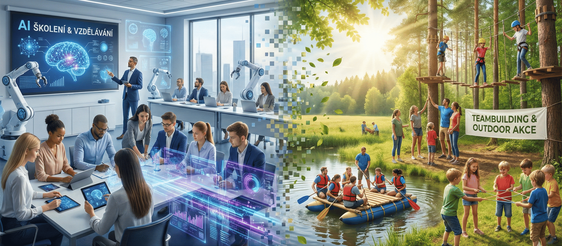 Když zrovna nevysvětluju AI, tak vymýšlím a realizuju teambuildingové výpravy, adaptační kurzy a školy v přírodě — akce, kde se lidi hýbou, smějou, občas zašpiní a hlavně znovu začnou fungovat jako tým. Z „meeting módu" do „montérek" přepnu za pět minut, protože mě baví obojí: hlava i pohyb, struktura i spontánnost.